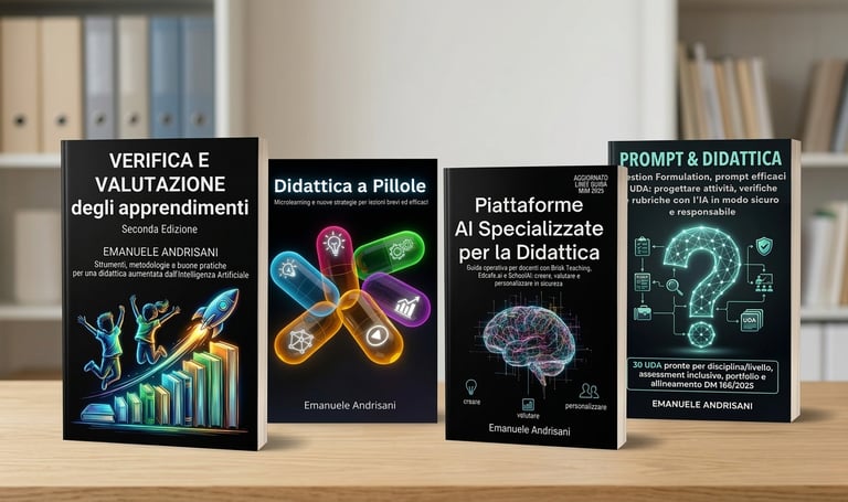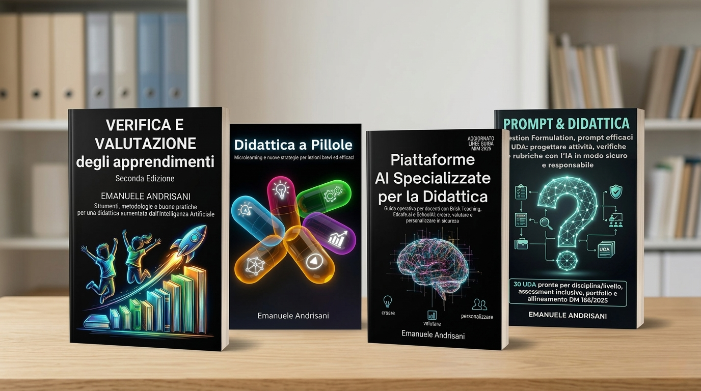 Una selezione di volumi dedicati all’uso educativo dell’intelligenza artificiale, alla progettazione didattica, alla valutazione e alla personalizzazione degli apprendimenti.